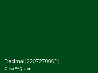 Decimal 2207270802 Color is a very dark green color and the nearest color is Crusoe #004816. Hex code #004918 and RGB value is rgb(0,73,24). In RGB color space, this color is composed of 0% red, 29% green, 9% blue, In CMYK color space, this color is composed of 100% cyan, 0% magenta, 67% yellow , 71% black , In HSL color space, this color has a hue angle of 140° , 100% saturation and 14% lightness.