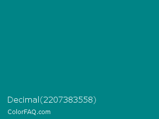 Decimal 2207383558 Color is a dark cyan color and the nearest color is Teal #008080. Hex code #008486 and RGB value is rgb(0,132,134). In RGB color space, this color is composed of 0% red, 52% green, 53% blue, In CMYK color space, this color is composed of 100% cyan, 1% magenta, 0% yellow , 47% black , In HSL color space, this color has a hue angle of 181° , 100% saturation and 26% lightness.