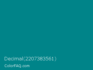 Decimal 2207383561 Color is a dark cyan color and the nearest color is Dark Cyan #008b8b. Hex code #008489 and RGB value is rgb(0,132,137). In RGB color space, this color is composed of 0% red, 52% green, 54% blue, In CMYK color space, this color is composed of 100% cyan, 4% magenta, 0% yellow , 46% black , In HSL color space, this color has a hue angle of 182° , 100% saturation and 27% lightness.