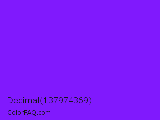 Decimal 137974369 Color is a normal violet color and the nearest color is Violet Color Wheel #7f00ff. Hex code #8019fd and RGB value is rgb(128,25,253). In RGB color space, this color is composed of 50% red, 10% green, 99% blue, In CMYK color space, this color is composed of 49% cyan, 90% magenta, 0% yellow , 1% black , In HSL color space, this color has a hue angle of 267° , 98% saturation and 55% lightness.