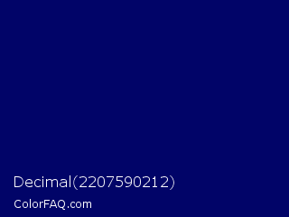 Decimal 2207590212 Color is a very dark blue color and the nearest color is Arapawa #110c6c. Hex code #010468 and RGB value is rgb(1,4,104). In RGB color space, this color is composed of 0% red, 2% green, 41% blue, In CMYK color space, this color is composed of 99% cyan, 96% magenta, 0% yellow , 59% black , In HSL color space, this color has a hue angle of 238° , 98% saturation and 21% lightness.