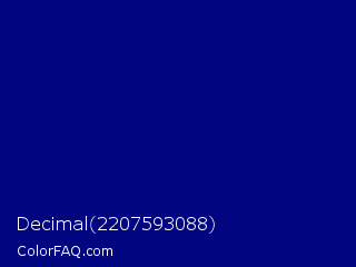 Decimal 2207593088 Color is a dark blue color and the nearest color is Navy Blue #000080. Hex code #010680 and RGB value is rgb(1,6,128). In RGB color space, this color is composed of 0% red, 2% green, 50% blue, In CMYK color space, this color is composed of 99% cyan, 95% magenta, 0% yellow , 50% black , In HSL color space, this color has a hue angle of 238° , 98% saturation and 25% lightness.