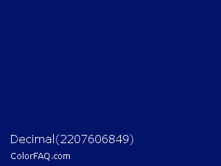 Decimal 2207606849 Color is a very dark blue color and the nearest color is Royal Blue #002366. Hex code #011469 and RGB value is rgb(1,20,105). In RGB color space, this color is composed of 0% red, 8% green, 41% blue, In CMYK color space, this color is composed of 99% cyan, 81% magenta, 0% yellow , 59% black , In HSL color space, this color has a hue angle of 229° , 98% saturation and 21% lightness.