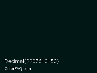 Decimal 2207610150 Color is a almost black cyan color and the nearest color is Holly #011d13. Hex code #011716 and RGB value is rgb(1,23,22). In RGB color space, this color is composed of 0% red, 9% green, 9% blue, In CMYK color space, this color is composed of 96% cyan, 0% magenta, 4% yellow , 91% black , In HSL color space, this color has a hue angle of 177° , 92% saturation and 5% lightness.