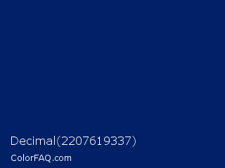 Decimal 2207619337 Color is a very dark blue color and the nearest color is Royal Blue #002366. Hex code #012065 and RGB value is rgb(1,32,101). In RGB color space, this color is composed of 0% red, 13% green, 40% blue, In CMYK color space, this color is composed of 99% cyan, 68% magenta, 0% yellow , 60% black , In HSL color space, this color has a hue angle of 221° , 98% saturation and 20% lightness.