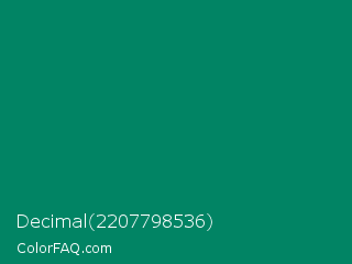 Decimal 2207798536 Color is a dark cyan color and the nearest color is Generic Viridian #007f66. Hex code #018464 and RGB value is rgb(1,132,100). In RGB color space, this color is composed of 0% red, 52% green, 39% blue, In CMYK color space, this color is composed of 99% cyan, 0% magenta, 24% yellow , 48% black , In HSL color space, this color has a hue angle of 165° , 98% saturation and 26% lightness.