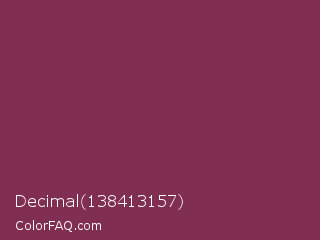 Decimal 138413157 Color is a normal rose color and the nearest color is Camelot #893456. Hex code #802e51 and RGB value is rgb(128,46,81). In RGB color space, this color is composed of 50% red, 18% green, 32% blue, In CMYK color space, this color is composed of 0% cyan, 64% magenta, 37% yellow , 50% black , In HSL color space, this color has a hue angle of 334° , 47% saturation and 34% lightness.