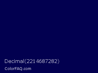 Decimal 2214687282 Color is a very dark indigo color and the nearest color is Stratos #000741. Hex code #020050 and RGB value is rgb(2,0,80). In RGB color space, this color is composed of 1% red, 0% green, 31% blue, In CMYK color space, this color is composed of 98% cyan, 100% magenta, 0% yellow , 69% black , In HSL color space, this color has a hue angle of 242° , 100% saturation and 16% lightness.