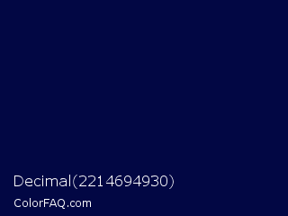 Decimal 2214694930 Color is a very dark blue color and the nearest color is Stratos #000741. Hex code #020744 and RGB value is rgb(2,7,68). In RGB color space, this color is composed of 1% red, 3% green, 27% blue, In CMYK color space, this color is composed of 97% cyan, 90% magenta, 0% yellow , 73% black , In HSL color space, this color has a hue angle of 235° , 94% saturation and 14% lightness.