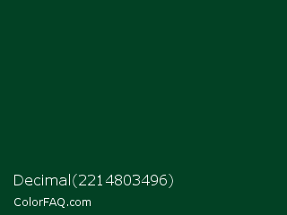 Decimal 2214803496 Color is a very dark green color and the nearest color is British Racing Green #004225. Hex code #024124 and RGB value is rgb(2,65,36). In RGB color space, this color is composed of 1% red, 25% green, 14% blue, In CMYK color space, this color is composed of 97% cyan, 0% magenta, 45% yellow , 75% black , In HSL color space, this color has a hue angle of 152° , 94% saturation and 13% lightness.