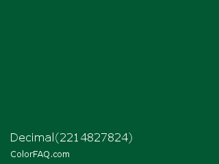Decimal 2214827824 Color is a very dark green color and the nearest color is Sacramento State Green #00563f. Hex code #025832 and RGB value is rgb(2,88,50). In RGB color space, this color is composed of 1% red, 35% green, 20% blue, In CMYK color space, this color is composed of 98% cyan, 0% magenta, 43% yellow , 65% black , In HSL color space, this color has a hue angle of 153° , 96% saturation and 18% lightness.