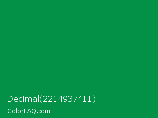 Decimal 2214937411 Color is a dark green color and the nearest color is Spanish Green #009150. Hex code #029147 and RGB value is rgb(2,145,71). In RGB color space, this color is composed of 1% red, 57% green, 28% blue, In CMYK color space, this color is composed of 99% cyan, 0% magenta, 51% yellow , 43% black , In HSL color space, this color has a hue angle of 149° , 97% saturation and 29% lightness.