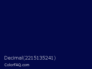 Decimal 2215135241 Color is a very dark blue color and the nearest color is Stratos #000741. Hex code #030849 and RGB value is rgb(3,8,73). In RGB color space, this color is composed of 1% red, 3% green, 29% blue, In CMYK color space, this color is composed of 96% cyan, 89% magenta, 0% yellow , 71% black , In HSL color space, this color has a hue angle of 236° , 92% saturation and 15% lightness.