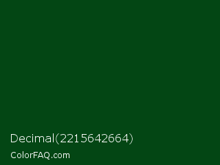 Decimal 2215642664 Color is a very dark green color and the nearest color is Crusoe #004816. Hex code #034614 and RGB value is rgb(3,70,20). In RGB color space, this color is composed of 1% red, 27% green, 8% blue, In CMYK color space, this color is composed of 96% cyan, 0% magenta, 71% yellow , 73% black , In HSL color space, this color has a hue angle of 135° , 92% saturation and 14% lightness.
