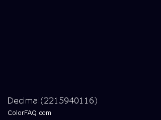 Decimal 2215940116 Color is a almost black indigo color and the nearest color is Jaguar #080110. Hex code #040316 and RGB value is rgb(4,3,22). In RGB color space, this color is composed of 2% red, 1% green, 9% blue, In CMYK color space, this color is composed of 82% cyan, 86% magenta, 0% yellow , 91% black , In HSL color space, this color has a hue angle of 243° , 76% saturation and 5% lightness.