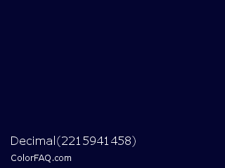 Decimal 2215941458 Color is a very dark blue color and the nearest color is Black Rock #0d0332. Hex code #040530 and RGB value is rgb(4,5,48). In RGB color space, this color is composed of 2% red, 2% green, 19% blue, In CMYK color space, this color is composed of 92% cyan, 90% magenta, 0% yellow , 81% black , In HSL color space, this color has a hue angle of 239° , 85% saturation and 10% lightness.