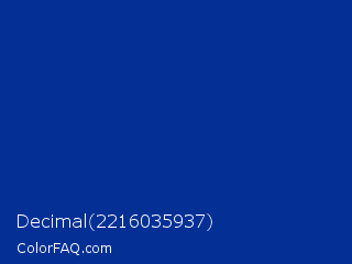 Decimal 2216035937 Color is a dark blue color and the nearest color is Smalt #003399. Hex code #043095 and RGB value is rgb(4,48,149). In RGB color space, this color is composed of 2% red, 19% green, 58% blue, In CMYK color space, this color is composed of 97% cyan, 68% magenta, 0% yellow , 42% black , In HSL color space, this color has a hue angle of 222° , 95% saturation and 30% lightness.