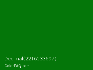 Decimal 2216133697 Color is a dark green color and the nearest color is Office Green #008000. Hex code #047609 and RGB value is rgb(4,118,9). In RGB color space, this color is composed of 2% red, 46% green, 4% blue, In CMYK color space, this color is composed of 97% cyan, 0% magenta, 92% yellow , 54% black , In HSL color space, this color has a hue angle of 123° , 93% saturation and 24% lightness.