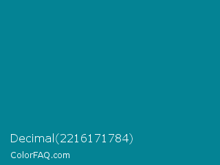 Decimal 2216171784 Color is a dark cyan color and the nearest color is Blue Chill #0c8990. Hex code #048394 and RGB value is rgb(4,131,148). In RGB color space, this color is composed of 2% red, 51% green, 58% blue, In CMYK color space, this color is composed of 97% cyan, 11% magenta, 0% yellow , 42% black , In HSL color space, this color has a hue angle of 187° , 95% saturation and 30% lightness.