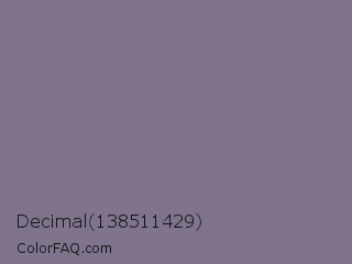 Decimal 138511429 Color is a normal violet color and the nearest color is Mobster #7f7589. Hex code #80748d and RGB value is rgb(128,116,141). In RGB color space, this color is composed of 50% red, 45% green, 55% blue, In CMYK color space, this color is composed of 9% cyan, 18% magenta, 0% yellow , 45% black , In HSL color space, this color has a hue angle of 269° , 10% saturation and 50% lightness.