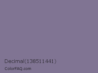 Decimal 138511441 Color is a normal violet color and the nearest color is Waterloo #7b7c94. Hex code #807493 and RGB value is rgb(128,116,147). In RGB color space, this color is composed of 50% red, 45% green, 58% blue, In CMYK color space, this color is composed of 13% cyan, 21% magenta, 0% yellow , 42% black , In HSL color space, this color has a hue angle of 263° , 13% saturation and 52% lightness.