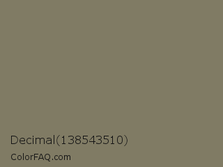 Decimal 138543510 Color is a normal yellow color and the nearest color is Flax Smoke #7b8265. Hex code #807b64 and RGB value is rgb(128,123,100). In RGB color space, this color is composed of 50% red, 48% green, 39% blue, In CMYK color space, this color is composed of 0% cyan, 4% magenta, 22% yellow , 50% black , In HSL color space, this color has a hue angle of 49° , 12% saturation and 45% lightness.