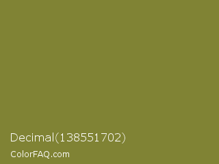 Decimal 138551702 Color is a normal yellow color and the nearest color is Old Moss Green #867e36. Hex code #808334 and RGB value is rgb(128,131,52). In RGB color space, this color is composed of 50% red, 51% green, 20% blue, In CMYK color space, this color is composed of 2% cyan, 0% magenta, 60% yellow , 49% black , In HSL color space, this color has a hue angle of 62° , 43% saturation and 36% lightness.