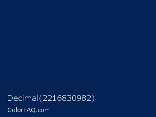 Decimal 2216830982 Color is a very dark blue color and the nearest color is Downriver #092256. Hex code #052356 and RGB value is rgb(5,35,86). In RGB color space, this color is composed of 2% red, 14% green, 34% blue, In CMYK color space, this color is composed of 94% cyan, 59% magenta, 0% yellow , 66% black , In HSL color space, this color has a hue angle of 218° , 89% saturation and 18% lightness.
