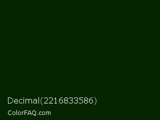 Decimal 2216833586 Color is a almost black green color and the nearest color is Deep Fir #002900. Hex code #052500 and RGB value is rgb(5,37,0). In RGB color space, this color is composed of 2% red, 15% green, 0% blue, In CMYK color space, this color is composed of 86% cyan, 0% magenta, 100% yellow , 85% black , In HSL color space, this color has a hue angle of 112° , 100% saturation and 7% lightness.