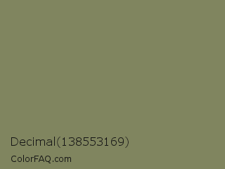 Decimal 138553169 Color is a normal yellow color and the nearest color is Flax Smoke #7b8265. Hex code #80855f and RGB value is rgb(128,133,95). In RGB color space, this color is composed of 50% red, 52% green, 37% blue, In CMYK color space, this color is composed of 4% cyan, 0% magenta, 29% yellow , 48% black , In HSL color space, this color has a hue angle of 68° , 17% saturation and 45% lightness.