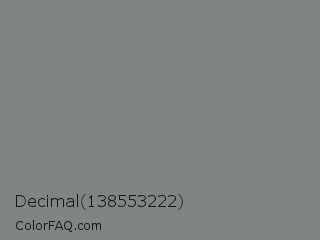 Decimal 138553222 Color is a normal green color and the nearest color is Gunsmoke #828685. Hex code #808582 and RGB value is rgb(128,133,130). In RGB color space, this color is composed of 50% red, 52% green, 51% blue, In CMYK color space, this color is composed of 4% cyan, 0% magenta, 2% yellow , 48% black , In HSL color space, this color has a hue angle of 144° , 2% saturation and 51% lightness.