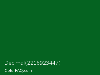 Decimal 2216923447 Color is a very dark green color and the nearest color is Camarone #00581a. Hex code #056321 and RGB value is rgb(5,99,33). In RGB color space, this color is composed of 2% red, 39% green, 13% blue, In CMYK color space, this color is composed of 95% cyan, 0% magenta, 67% yellow , 61% black , In HSL color space, this color has a hue angle of 138° , 90% saturation and 20% lightness.