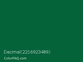 Decimal 2216923489 Color is a very dark green color and the nearest color is Cadmium Green #006b3c. Hex code #056339 and RGB value is rgb(5,99,57). In RGB color space, this color is composed of 2% red, 39% green, 22% blue, In CMYK color space, this color is composed of 95% cyan, 0% magenta, 42% yellow , 61% black , In HSL color space, this color has a hue angle of 153° , 90% saturation and 20% lightness.