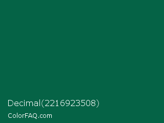 Decimal 2216923508 Color is a very dark green color and the nearest color is Bottle Green #006a4e. Hex code #056346 and RGB value is rgb(5,99,70). In RGB color space, this color is composed of 2% red, 39% green, 27% blue, In CMYK color space, this color is composed of 95% cyan, 0% magenta, 29% yellow , 61% black , In HSL color space, this color has a hue angle of 161° , 90% saturation and 20% lightness.