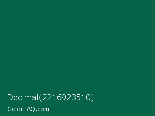 Decimal 2216923510 Color is a very dark green color and the nearest color is Bottle Green #006a4e. Hex code #056348 and RGB value is rgb(5,99,72). In RGB color space, this color is composed of 2% red, 39% green, 28% blue, In CMYK color space, this color is composed of 95% cyan, 0% magenta, 27% yellow , 61% black , In HSL color space, this color has a hue angle of 163° , 90% saturation and 20% lightness.