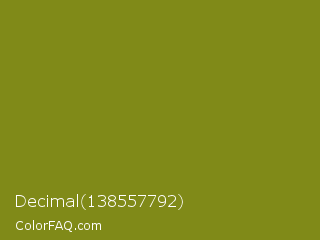 Decimal 138557792 Color is a normal yellow color and the nearest color is Trendy Green #7c881a. Hex code #808a18 and RGB value is rgb(128,138,24). In RGB color space, this color is composed of 50% red, 54% green, 9% blue, In CMYK color space, this color is composed of 7% cyan, 0% magenta, 83% yellow , 46% black , In HSL color space, this color has a hue angle of 65° , 70% saturation and 32% lightness.