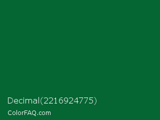 Decimal 2216924775 Color is a very dark green color and the nearest color is Fun Green #016d39. Hex code #056533 and RGB value is rgb(5,101,51). In RGB color space, this color is composed of 2% red, 40% green, 20% blue, In CMYK color space, this color is composed of 95% cyan, 0% magenta, 50% yellow , 60% black , In HSL color space, this color has a hue angle of 149° , 91% saturation and 21% lightness.