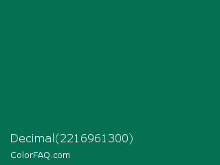 Decimal 2216961300 Color is a dark green color and the nearest color is Watercourse #056f57. Hex code #057052 and RGB value is rgb(5,112,82). In RGB color space, this color is composed of 2% red, 44% green, 32% blue, In CMYK color space, this color is composed of 96% cyan, 0% magenta, 27% yellow , 56% black , In HSL color space, this color has a hue angle of 163° , 91% saturation and 23% lightness.