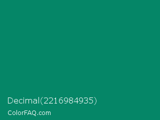 Decimal 2216984935 Color is a dark cyan color and the nearest color is Deep Sea #01826b. Hex code #058667 and RGB value is rgb(5,134,103). In RGB color space, this color is composed of 2% red, 53% green, 40% blue, In CMYK color space, this color is composed of 96% cyan, 0% magenta, 23% yellow , 47% black , In HSL color space, this color has a hue angle of 166° , 93% saturation and 27% lightness.