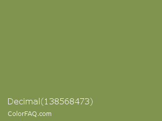 Decimal 138568473 Color is a normal lime color and the nearest color is Moss Green #8a9a5b. Hex code #80934f and RGB value is rgb(128,147,79). In RGB color space, this color is composed of 50% red, 58% green, 31% blue, In CMYK color space, this color is composed of 13% cyan, 0% magenta, 46% yellow , 42% black , In HSL color space, this color has a hue angle of 77° , 30% saturation and 44% lightness.