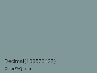 Decimal 138573427 Color is a normal cyan color and the nearest color is Regent Gray #86949f. Hex code #809899 and RGB value is rgb(128,152,153). In RGB color space, this color is composed of 50% red, 60% green, 60% blue, In CMYK color space, this color is composed of 16% cyan, 1% magenta, 0% yellow , 40% black , In HSL color space, this color has a hue angle of 182° , 11% saturation and 55% lightness.