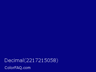 Decimal 2217215058 Color is a dark indigo color and the nearest color is Navy Blue #000080. Hex code #060484 and RGB value is rgb(6,4,132). In RGB color space, this color is composed of 2% red, 2% green, 52% blue, In CMYK color space, this color is composed of 95% cyan, 97% magenta, 0% yellow , 48% black , In HSL color space, this color has a hue angle of 241° , 94% saturation and 27% lightness.
