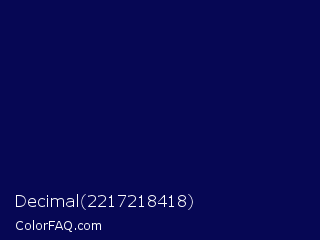 Decimal 2217218418 Color is a very dark blue color and the nearest color is Gulf Blue #051657. Hex code #060754 and RGB value is rgb(6,7,84). In RGB color space, this color is composed of 2% red, 3% green, 33% blue, In CMYK color space, this color is composed of 93% cyan, 92% magenta, 0% yellow , 67% black , In HSL color space, this color has a hue angle of 239° , 87% saturation and 18% lightness.