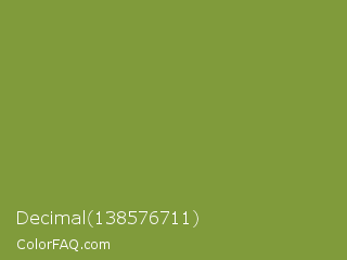 Decimal 138576711 Color is a normal lime color and the nearest color is Sushi #87ab39. Hex code #809b3b and RGB value is rgb(128,155,59). In RGB color space, this color is composed of 50% red, 61% green, 23% blue, In CMYK color space, this color is composed of 17% cyan, 0% magenta, 62% yellow , 39% black , In HSL color space, this color has a hue angle of 77° , 45% saturation and 42% lightness.
