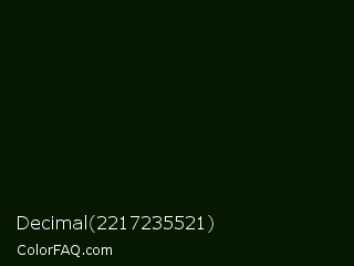 Decimal 2217235521 Color is a almost black green color and the nearest color is Black Forest #0b1304. Hex code #061801 and RGB value is rgb(6,24,1). In RGB color space, this color is composed of 2% red, 9% green, 0% blue, In CMYK color space, this color is composed of 75% cyan, 0% magenta, 96% yellow , 91% black , In HSL color space, this color has a hue angle of 107° , 92% saturation and 5% lightness.