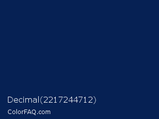 Decimal 2217244712 Color is a very dark blue color and the nearest color is Downriver #092256. Hex code #062154 and RGB value is rgb(6,33,84). In RGB color space, this color is composed of 2% red, 13% green, 33% blue, In CMYK color space, this color is composed of 93% cyan, 61% magenta, 0% yellow , 67% black , In HSL color space, this color has a hue angle of 219° , 87% saturation and 18% lightness.
