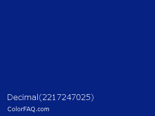 Decimal 2217247025 Color is a dark blue color and the nearest color is Resolution Blue #002387. Hex code #062283 and RGB value is rgb(6,34,131). In RGB color space, this color is composed of 2% red, 13% green, 51% blue, In CMYK color space, this color is composed of 95% cyan, 74% magenta, 0% yellow , 49% black , In HSL color space, this color has a hue angle of 227° , 91% saturation and 27% lightness.
