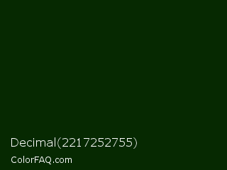 Decimal 2217252755 Color is a almost black green color and the nearest color is Deep Fir #002900. Hex code #062901 and RGB value is rgb(6,41,1). In RGB color space, this color is composed of 2% red, 16% green, 0% blue, In CMYK color space, this color is composed of 85% cyan, 0% magenta, 98% yellow , 84% black , In HSL color space, this color has a hue angle of 113° , 95% saturation and 8% lightness.