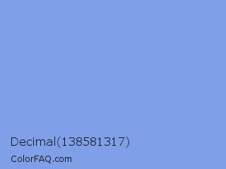 Decimal 138581317 Color is a light blue color and the nearest color is Portage #8b9fee. Hex code #809fe9 and RGB value is rgb(128,159,233). In RGB color space, this color is composed of 50% red, 62% green, 91% blue, In CMYK color space, this color is composed of 45% cyan, 32% magenta, 0% yellow , 9% black , In HSL color space, this color has a hue angle of 222° , 70% saturation and 71% lightness.