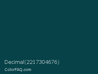Decimal 2217304676 Color is a very dark cyan color and the nearest color is Warm Black #004242. Hex code #064248 and RGB value is rgb(6,66,72). In RGB color space, this color is composed of 2% red, 26% green, 28% blue, In CMYK color space, this color is composed of 92% cyan, 8% magenta, 0% yellow , 72% black , In HSL color space, this color has a hue angle of 185° , 85% saturation and 15% lightness.